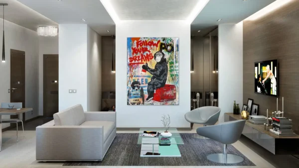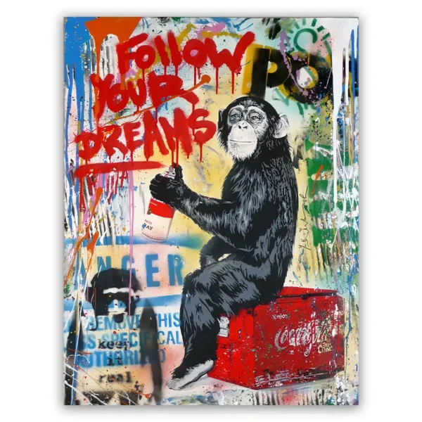 Banksy Street Art, deze Monkey dreams is een combinatie van meerdere werken van deze bekende Engelse Street Art artiest. Een ware Eye Catcher.