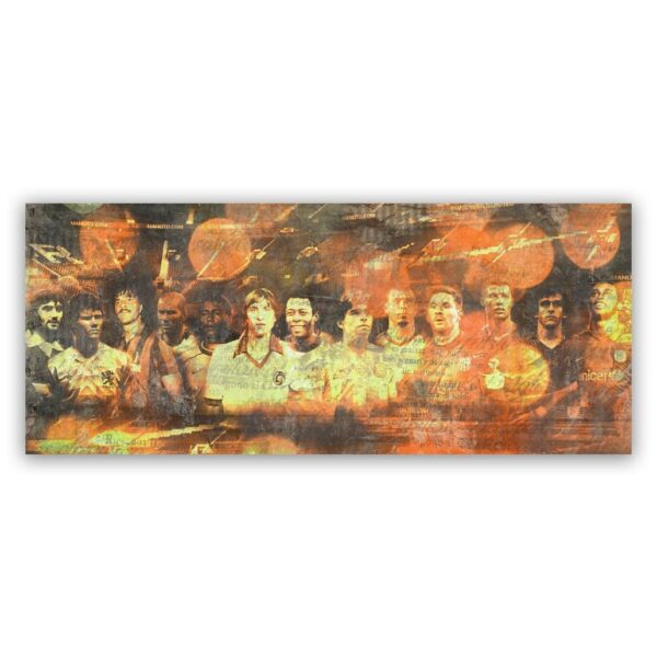 De beste voetballers aller tijden bij elkaar, wil je een andere speler die naar jou mening ertussen hoort kan dat natuurlijk ook. Van Pele tot Maradona en van Cruijff tot Ronaldo en Messi, alle toppers staan op dit unieke werk. Met op de achtergrond stadion Old Trafford van Manchester United.Â