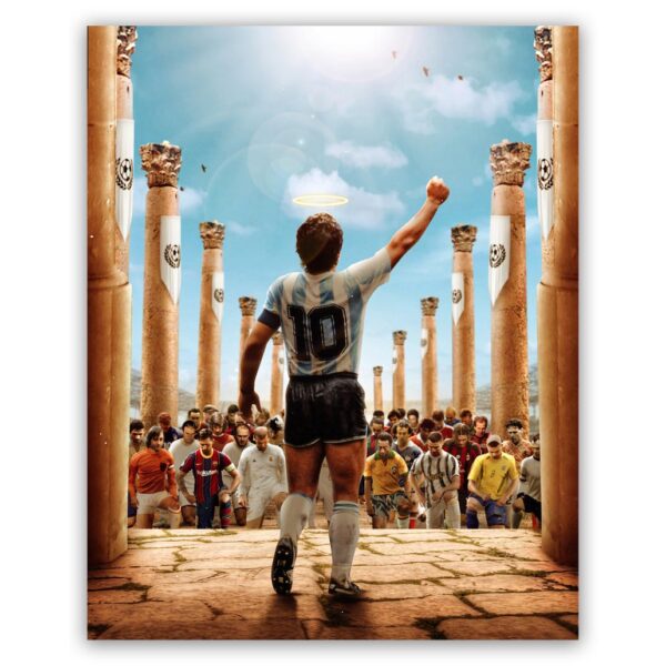Diego Maradona met knielend voor hem de alle grootste voetballers ooit ( op hem na ) . Diego Armando Maradona was een Argentijns profvoetballer en voetbaltrainer. Hij wordt beschouwd als een van de beste voetballers ooit. Op het WK in 1986 was hij dé vedette, die Argentinië naar de wereldtitel leidde. Het Italiaanse Napoli hielp hij in 1987 aan een eerste landstitel.