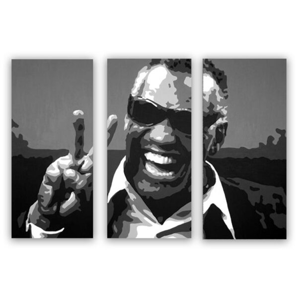 Ray Charles was een blinde Amerikaanse zanger, pianist en componist van de moderne blues en de rhythm-and-blues, soul, jazz en popmuziek. Dit handgeschilderde 3 luik popart schilderij is verkrijgbaar in de afmetingen: 3 x 40 x 80 cm ( Totaal 1.20 meter breed x 0.8 meter hoog)