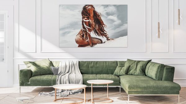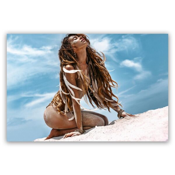Schilderij van een vrouw zittend op een tropsich strand. Dit unieke werk in Bohemian stijl is verkrijgbaar in verschillende kleuren en formaten.